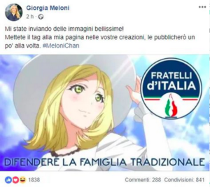 こうした流れであるユーザーが#MeloniChanのハッシュタグを付けて以下の画像を投稿します。このキャラクターが選ばれた理由はイタリア系の血が入った設定のためと思われます。メローニ氏はFacebookでこの投稿をシェア(現在は削除または公開範囲限定)しました。※この時点ではまだ小原鞠莉の名前は出ていません。
